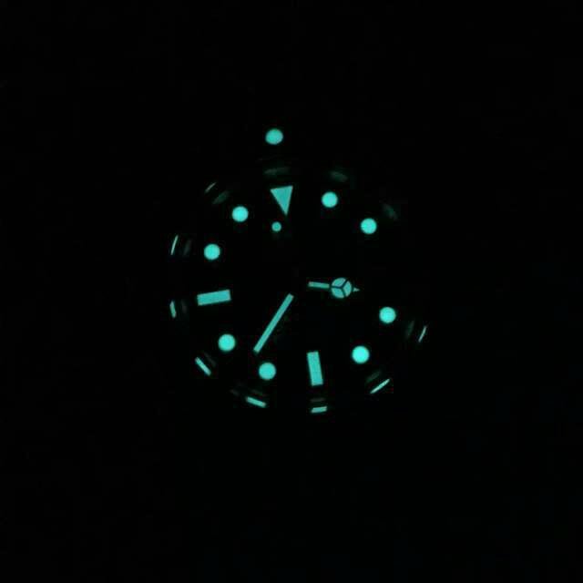 - 視認性を極めた文字盤: マキシダイヤルと呼ばれる、より大型化されたインデックスと太い針が採用されています。インデックスの縁もゴールドでコーティングされており、内部には高品質なスーパールミノバがたっぷりと充填されているため、暗闇でも時刻をはっきりと読み取ることができます。
